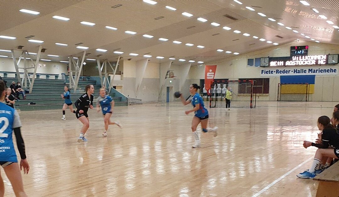 Es dauerte allerding vier Minuten, ehe Greta Schade mit einem verwandelten Strafwurf das 1:0 für die Gastgeberinnen erzielte. Nach einem Doppelpack der wiedergenesenen Augusta Gerner stand es 7 Minuten später 8:0 für den RHC und Gästetrainer Daniel Lemke nahm seine Auszeit. Immerhin konnten seine Schützlinge unmittelbar danach das 1:8 erzielen, doch die Hansestädterinnen ließen sich nicht beirren, zogen in der Folge auf 15:1 (18.) und bis zur Pause sogar auf 20:4 davon. Die im ersten Durchgang von beiden Teams geforderte offensive Abwehr ermöglichte den technisch und läuferisch überlegenen Rostockerinnen immer wieder, durch die sich bietenden Lücken erfolgreich zum Abschluss zu kommen. Die RHC-Deckung um Torhüterin Lia Knischka hatte hinten alles im Griff und so kamen die Einheimischen immer wieder auch in ihr Konterspiel, zumal die Fehlerquote in den ersten 25 Minuten sehr gering war.